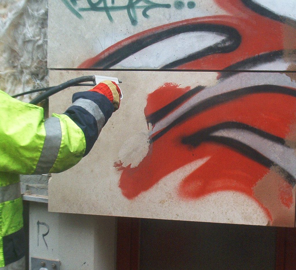 - prodotti chimici specifici: sciolgono i pigmenti delle bombolette senza intaccare il materiale sottostante. Sono adatti soprattutto su superfici lisce e non porose;